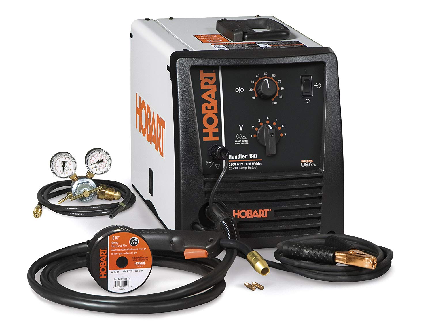 Handler 190 with built-in gas valve, 10 ft. MIG gun, dual gauge regulator & gas hose, 10-ft work cable & clamp, 10-ft power cord, extra . 030 contact tips, sample spool of . 030 flux-cored wire, 8 inch spool adapter, owners manual and set-up guide.